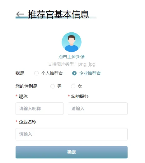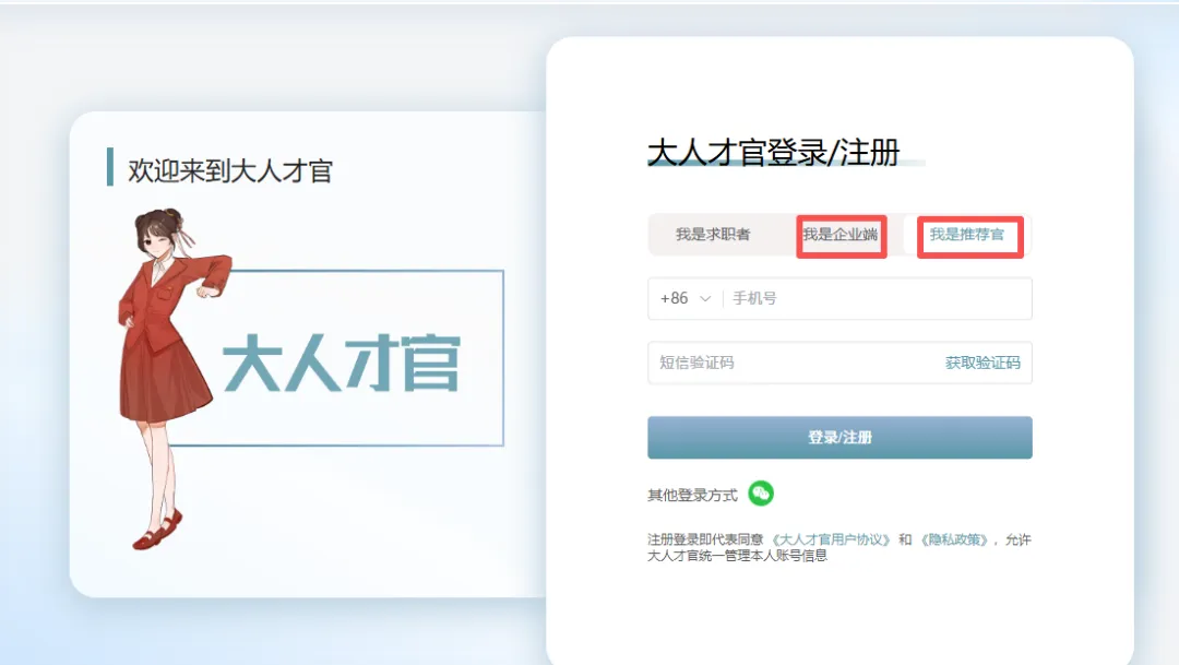 【去登录】→【我是企业端/我是推荐官】→【推荐官可选个人/企业(猎头/乙方企业选择企业,SOHO猎头顾问/内推者选择个人)】→【输入信息】