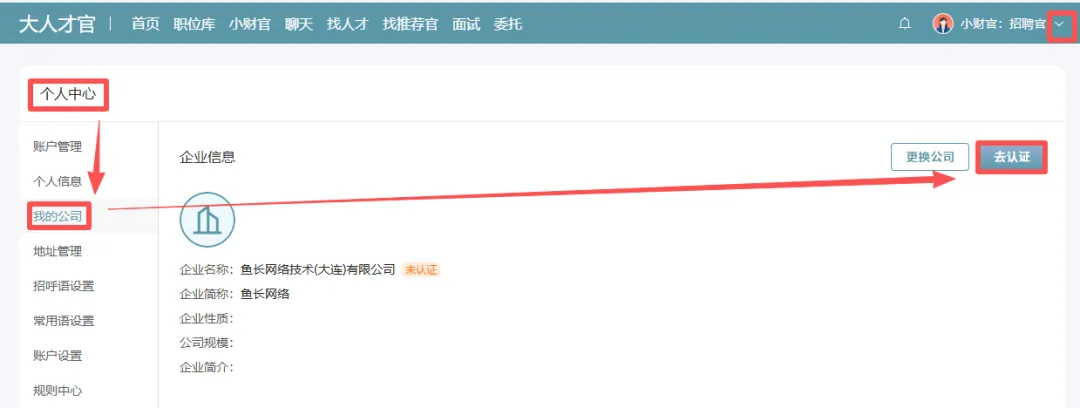【右上角个人中心】→【我的公司】→【去认证】→【上传营业执照】→【提交认证】