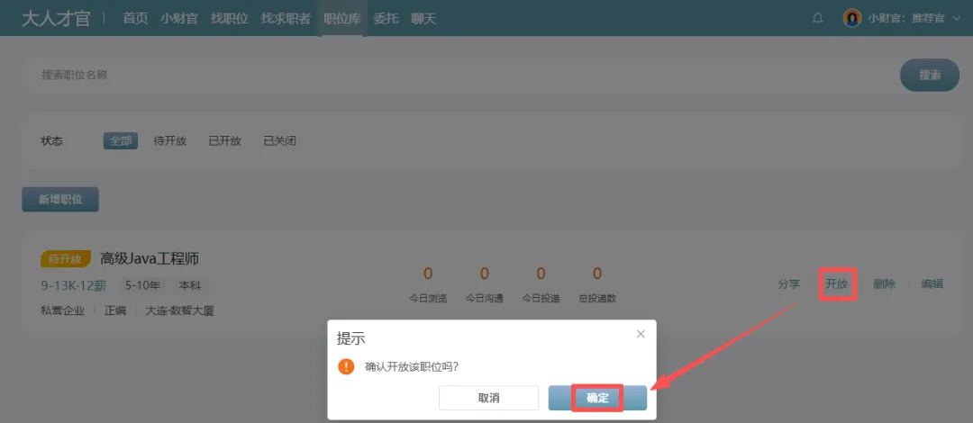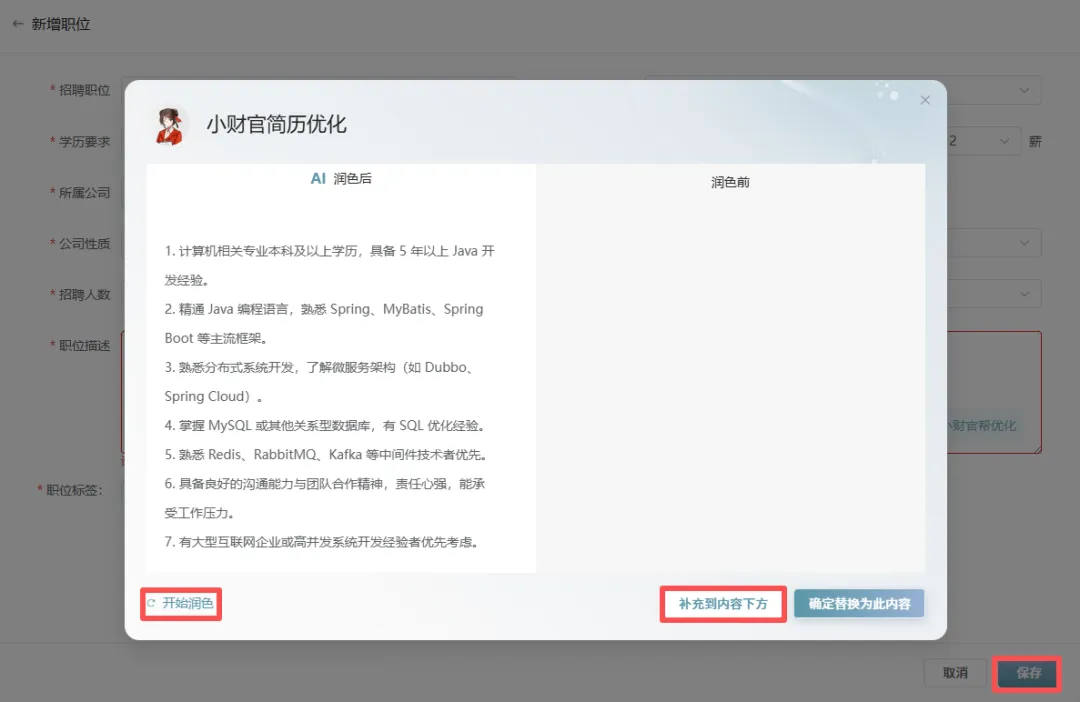 【职位库】→【新增职位】→【填写职位信息】→职位描述不会写可以点【小财官帮优化】→【开始润色】→【补充到内容下方】→【保存】→【开放】→【确定】