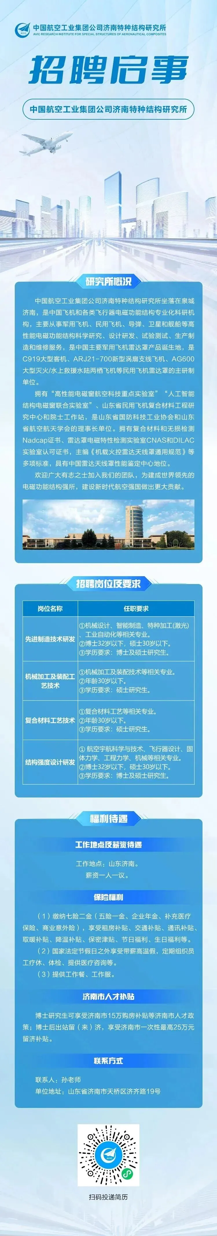 【济南】央企,七险二金、福利多样,人才补贴15w+!中国航空工业集团公司济南特种结构研究所招聘公告,报名中