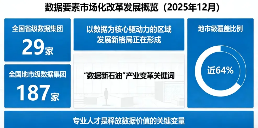 随着数字中国战略向纵深推进,数据要素市场化改革步入全面落地新阶段。截至2025年12月,全国已成立29家省级数据集团、187家地市级集团,覆盖近64%的地市,标志着以数据为核心驱动力的区域发展新格局正在形成。在这场围绕“数据新石油”的产业变革中,专业人才已成为决定数据价值能否充分释放的关键变量。