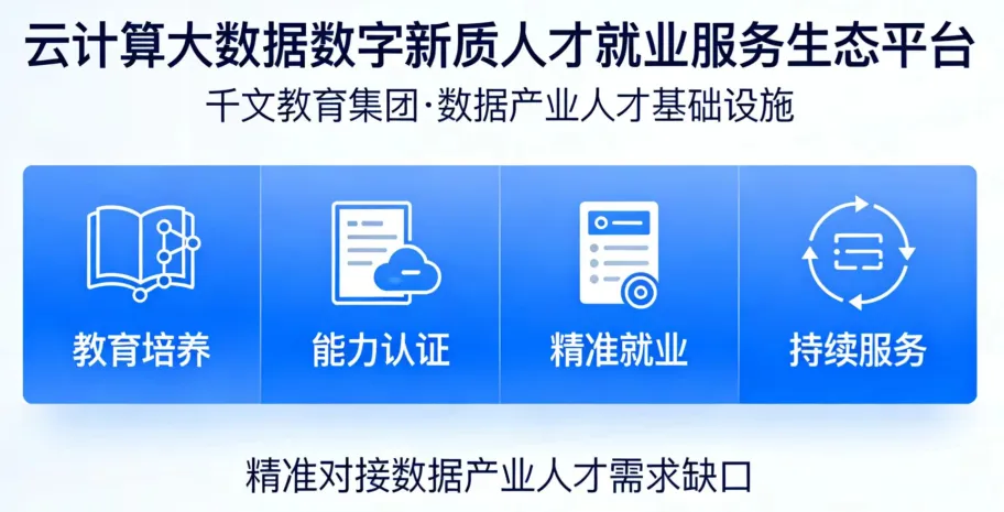 千文教育集团深刻洞察这一历史性机遇,率先构建“云计算大数据数字新质人才就业服务生态平台”,以“教育培养—能力认证—精准就业—持续服务”的一体化生态模式,精准对接数据产业发展的人才需求缺口,致力于成为支撑数据要素市场化改革的关键人才基础设施。
