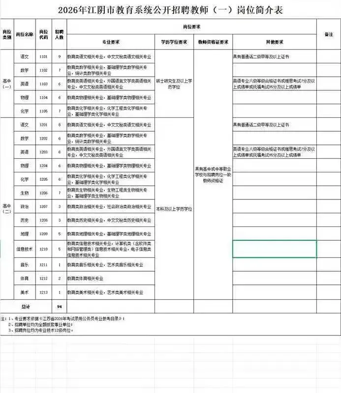 根据《省教育厅省人力资源和社会保障厅关于进一步做好全省中小学校新进教师公开招聘工作的意见》(苏教规〔2016〕1号)、《江苏省事业单位公开招聘人员办法》(苏办发〔2020〕9号)文件精神,结合我市教育事业发展需要,江阴市教育系统面向社会公开招聘全额拨款事业单位编制教师94名(岗位明细详见附件1、附件2)。现将有关事项公告如下:
