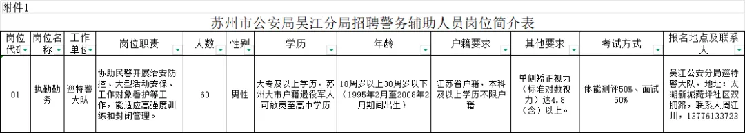 2.报名地点详见《苏州市公安局吴江分局招聘警务辅助人员岗位简介表》 (附件1)