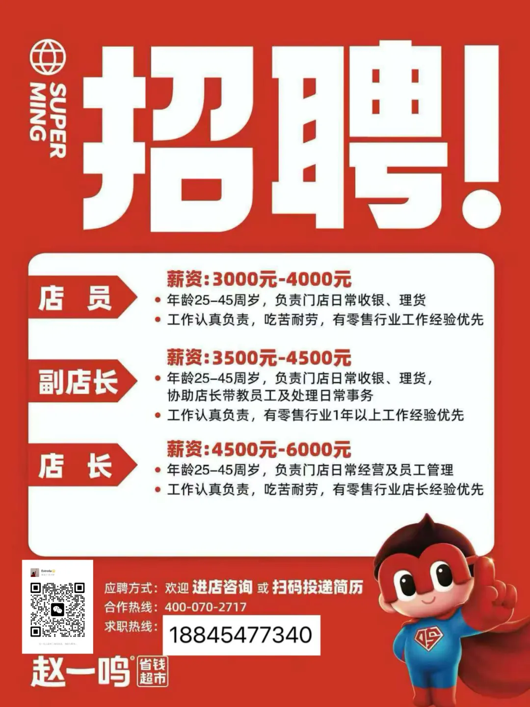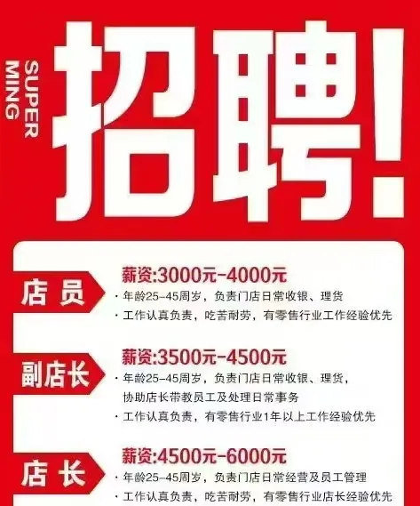 要 求:工作认真负责,吃苦耐劳,有零售行业工作经验优先,男女不限。