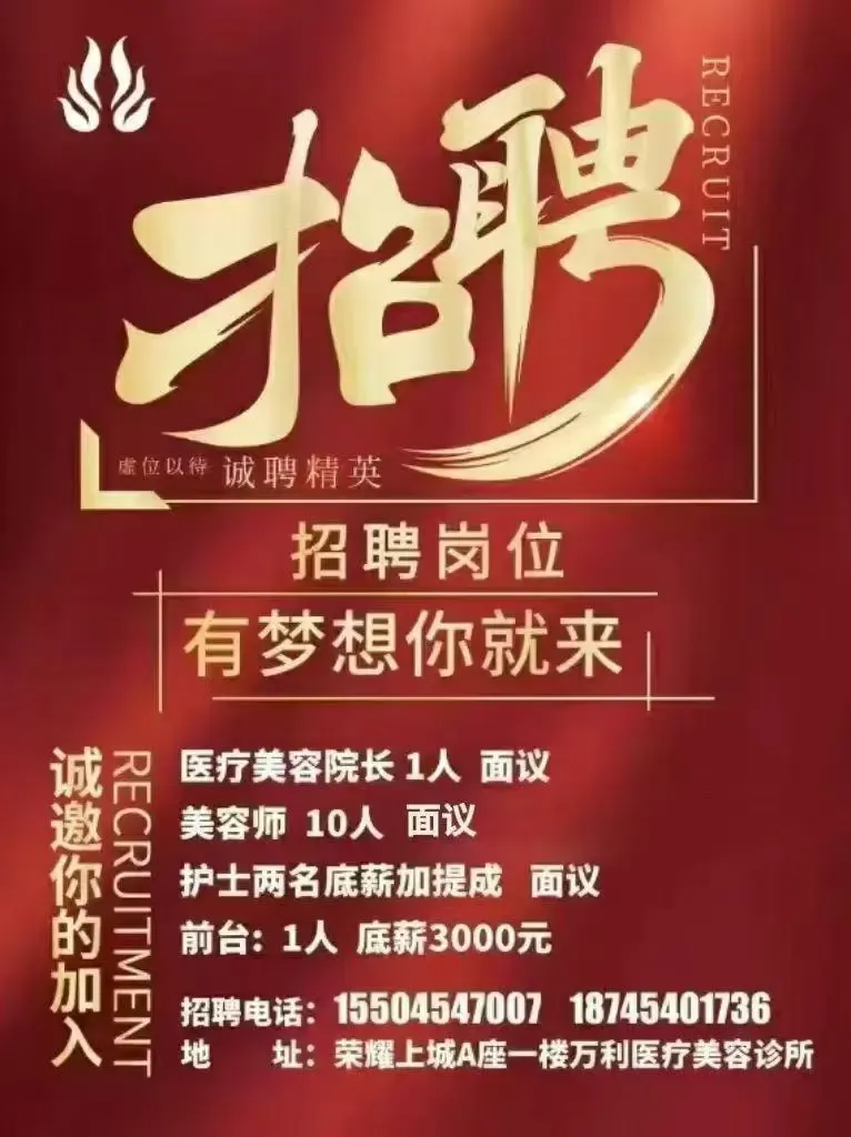 万利医疗美容诊所扩店经营,招聘美容学员若干,工资面议。