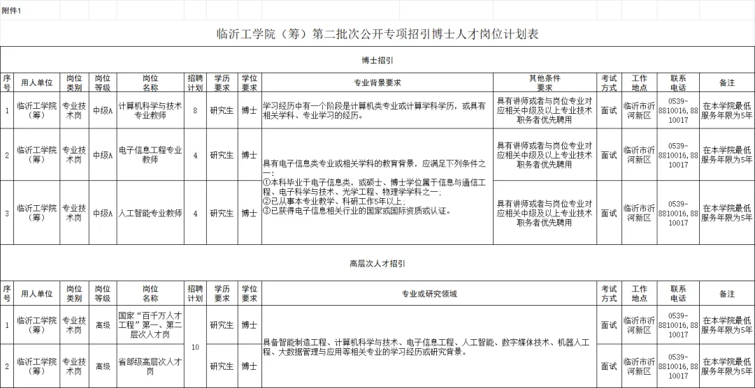 附件:1.临沂工学院(筹)第二批次公开专项招引博士人才岗位计划表
