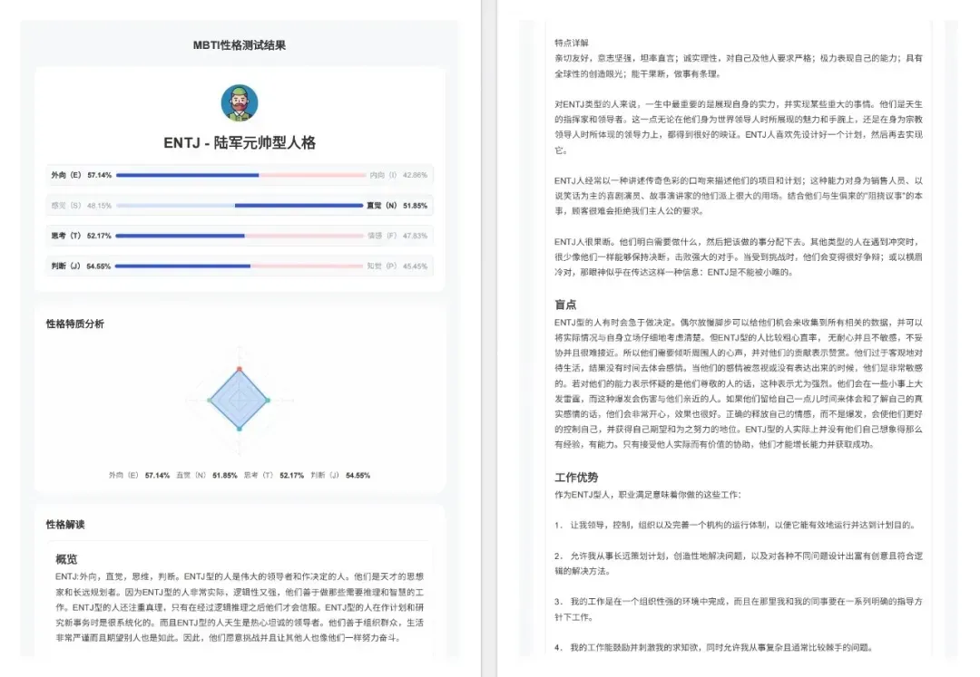 免费MBTI、九型人格、PDP、DISC测评,既可自测,也可以用于招聘测评,AI生成岗位匹配度分析报告,完整版报告可下载。