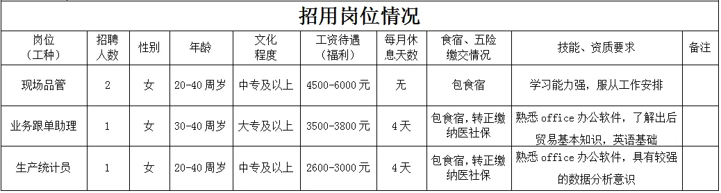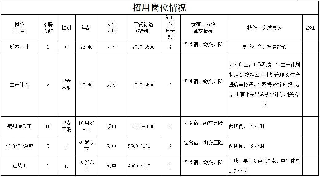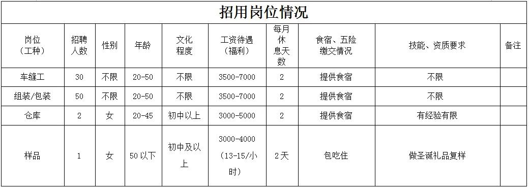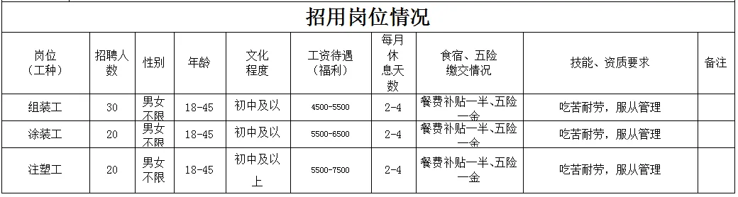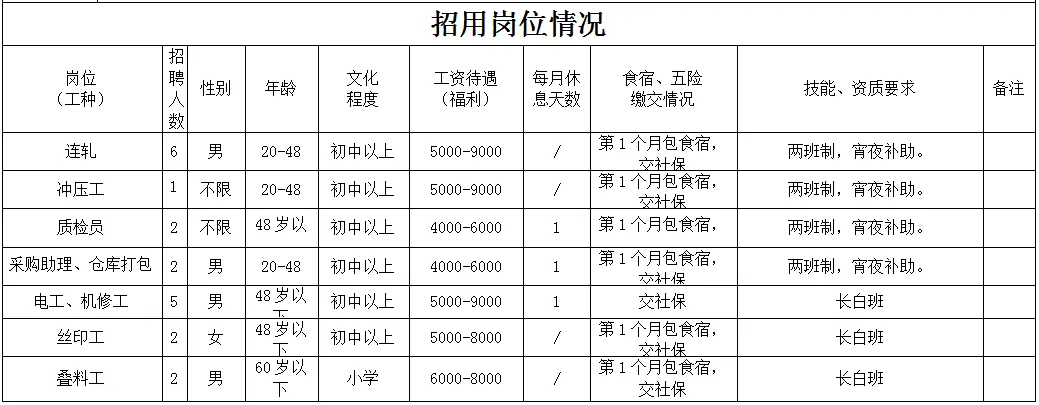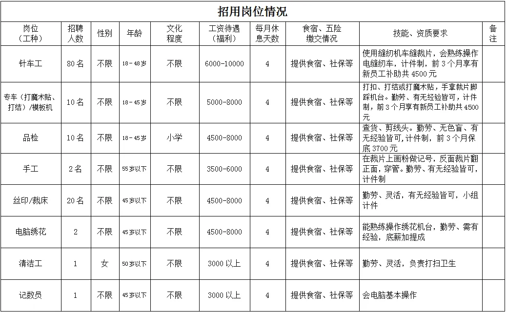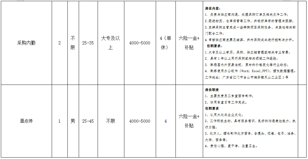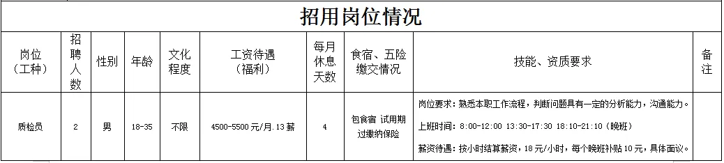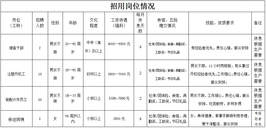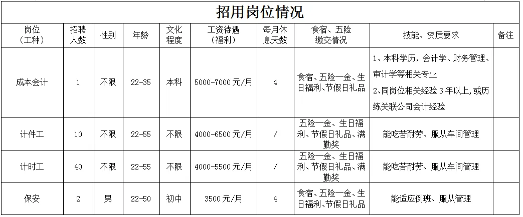 福利待遇:月工作26天满勤制,公司行政人员八小时工作制。一线员工两班倒,计件工资4500-7000元/月,工资每月按时发放。享有六险一金、免费体检、年终奖等福利。