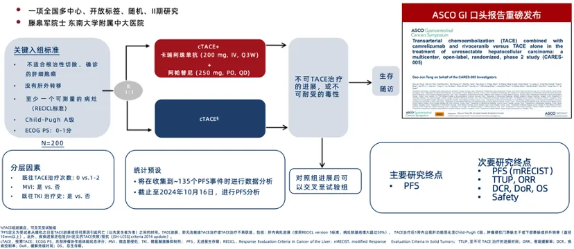 2025年1月,由东南大学附属中大医院滕皋军院士领衔、全国多中心协作开展的CARES-005研究在美国临床肿瘤学会消化肿瘤研讨会(ASCO-GI)上重磅发布核心数据,揭示了TACE联合“双艾”方案在不可切除HCC治疗中的显著疗效优势1。