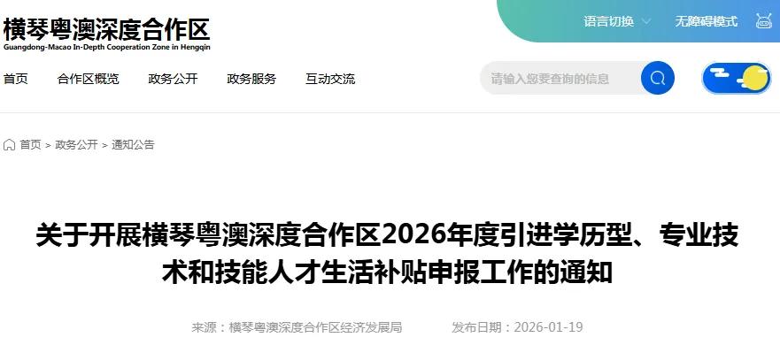 关于开展横琴粤澳深度合作区2026年度引进学历型、专业技术和技能人才生活补贴申报工作的通知