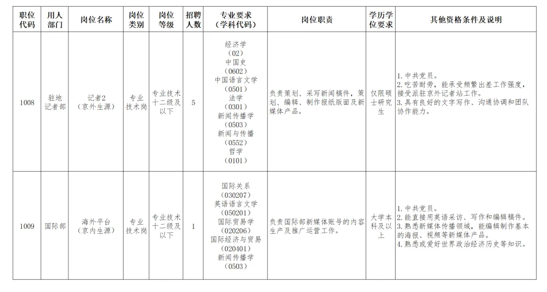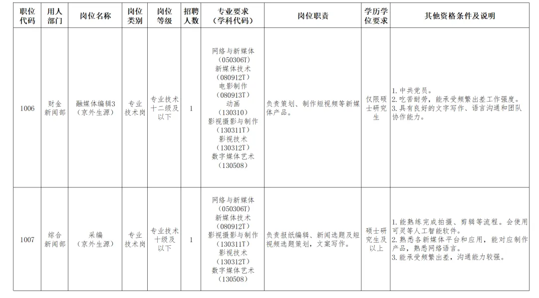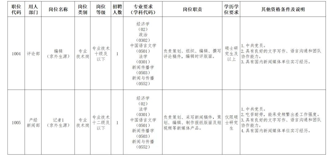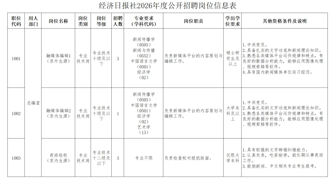 此次招聘涉及15个岗位,具体岗位及资格条件详见《经济日报社2026年度公开招聘岗位信息表》。其中,有关岗位专业条件参考教育部公布的学科专业目录。