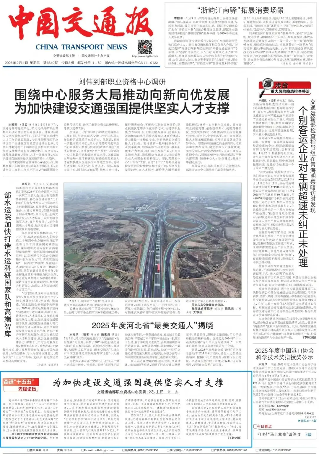 三是以“专家学者、大国工匠进校园”为载体,大力弘扬新时代交通精神,构建“大思政课”新格局。2024年,交通运输部、人力资源和社会保障部成功举办了“专家创新大讲堂”活动。2025年,按照部教育培训要点要求,部职业资格中心举办了4期“专家学者、大国工匠进校园”活动,邀请刘加平、王景全、邓文中院士等专家学者,许振超、孔祥瑞等人民工匠、全国劳模和苏权科等国家卓越工程师,走进交通运输高等院校,推进思政教育、职业引导和技术传承有机融合,打造“讲好交通故事、传承工匠精神、引领青年成长”的人才培养创新载体。