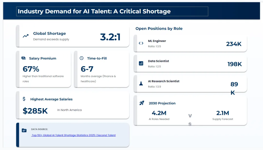 家长们请注意:进入 2026 年,AI 人才市场的竞争已进入白热化。根据 2025 全球 AI 人才短缺统计数据,目前行业正面临严峻的人才荒: