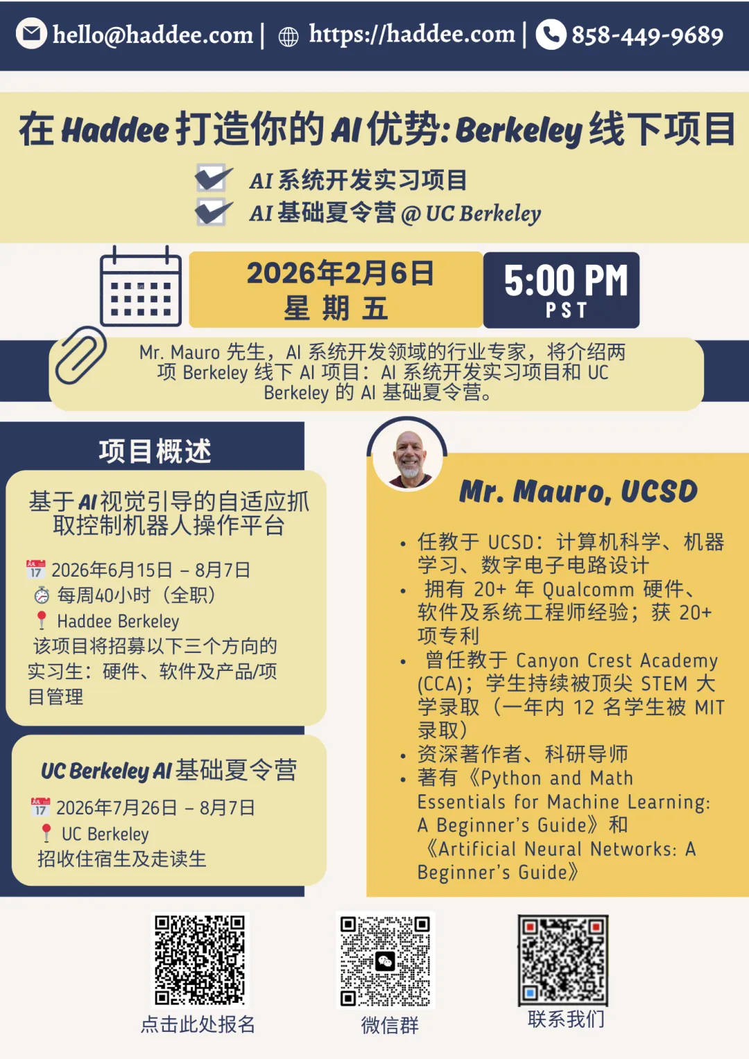💡 Haddee 建议: 在竞争白热化的今天,名校更看重学生的“实战产出”与“科研潜质”。在这个夏天,让孩子在伯克利与硅谷导师共同开启一段改变履历的科研之旅!