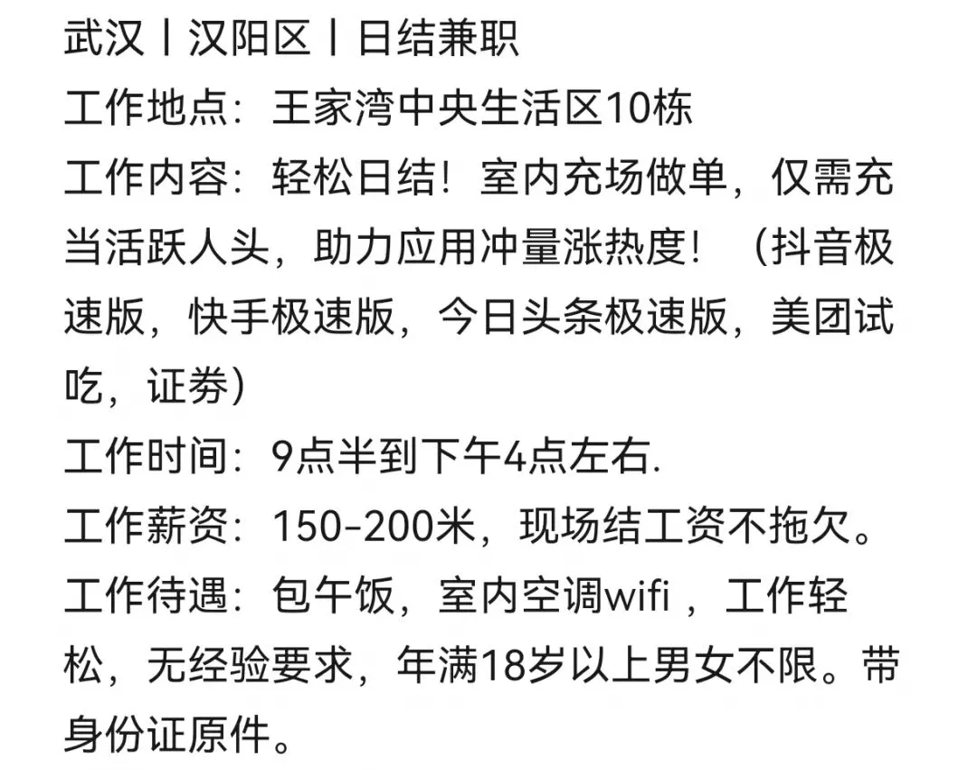 时间: 10:00 - 20:00或12:00 - 22:00 (两个时间段可选)内容:配合商铺售卖商品,主要负责检票及维持现场秩序,工作简单易上手。要求:18 - 35岁女性,能吃苦耐劳,不娇惯。地址:武汉徐东附近工资:110元/天 + 包两餐 ,过年初一至初五5天,每天额外补贴100元。工资压五天后每日结算,如有特殊情况可适当调休。报名添加:请将姓名、电话、年龄、照片、身高,以及简单自我介绍视频发送至微信