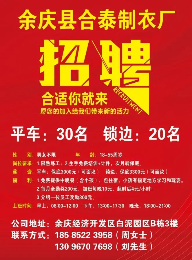 ✅ 要求:18-55 岁,能吃苦耐劳,熟练工优先