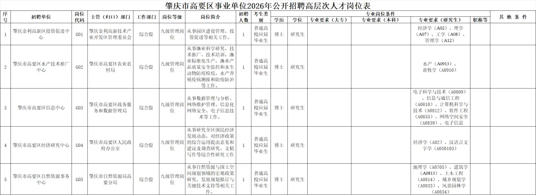 本次招聘包含肇庆金利高新区投资促进中心、高要区水产技术推广中心、高要区信息中心、高要区经济研究中心、高要区自然资源事务中心等5个事业单位,均为公益一类事业单位。
