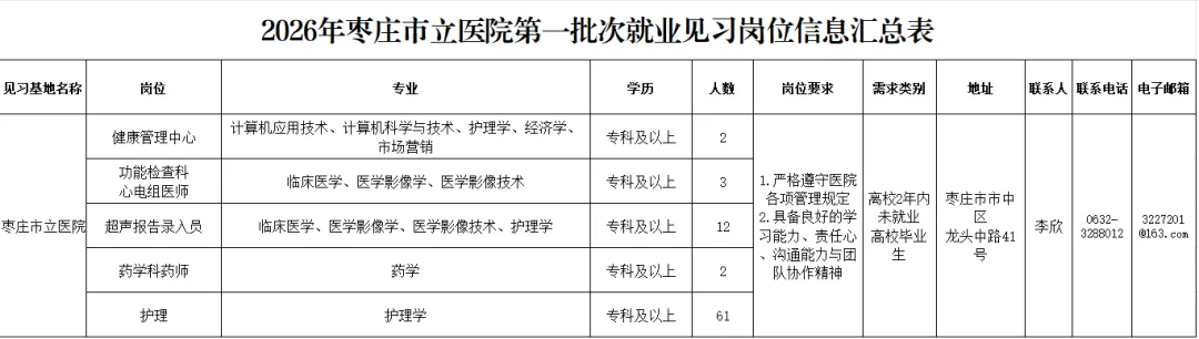 招聘岗位、专业及具体要求详见《2026年枣庄市立医院第一批次就业见习岗位信息汇总表》(附件1)