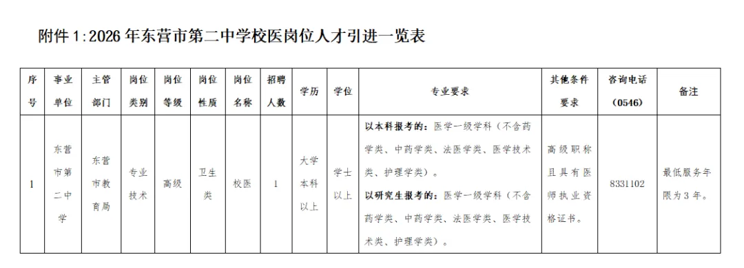 在报名过程中有问题的,可拨打咨询电话:0546-8331102(市直事业编制)根据事业单位公开招聘有关规定,结合学校教育教学需求,现将2026年东营市第二中学校医岗位人才引进工作有关事项公告如下:一、引进范围具有高级职称的执业医师。二、引进岗位及数量2026年东营市第二中学校医岗位人才引进岗位具体情况详见一览表(附件1)。三、引进条件1.具有中华人民共和国国籍;2.年龄应在43周岁以下(1982年2月以后出生);3.遵守中华人民共和国宪法和法律,拥护中国共产党领导和社会主义制度;4.具有良好的道德品行和适应岗位的身体条件、心理素质;5.具有招聘岗位要求的专业或技能条件;6.具有招聘岗位所需要的其他条件;7.法律、法规规定的其他条件。现役军人,在读的非应届毕业生,因犯罪受过刑事处罚的人员,被开除党籍的人员,被开除公职的人员,被依法列为失信联合惩戒对象的人员,以及法律法规规定不得聘用的其他情形人员不得应聘。在职人员(含已签订就业协议的人员)应聘的需经用人权限部门单位同意。应聘人员不得应聘有《事业单位人事管理回避规定》(人社部规〔2019〕1号)规定情形的岗位。四、选聘程序(一)报名1.提交报名申请报名时间:2026年2月4日8:30—2月12日16:00。查询时间:2026年2月4日11:00—2月13日11:00。报名方式:应聘人员登录东营市第二中学网站(http:www.dysez.net)报名。2026年东营市第二中学人才引进报名系统(点击进入)