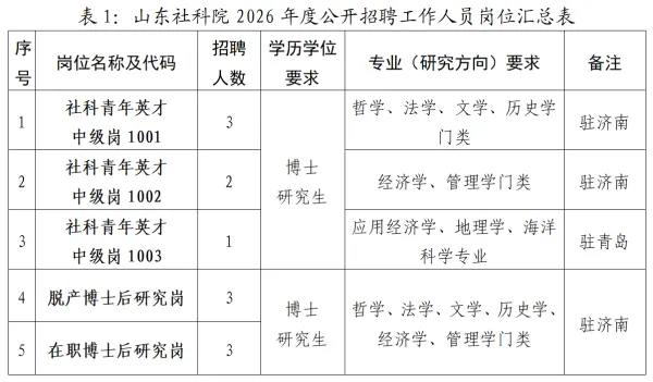 山东社会科学院始建于1978年,是山东省委直属的综合性社会科学研究机构、正厅级公益一类事业单位。2026年,根据事业发展需要,山东社会科学院拟面向社会公开招聘优秀博士研究生12人,其中专业技术中级岗位6人、博士后研究岗位6人。具体岗位及条件详见下表,各研究部门重点需求方向及联系方式详见《山东社会科学院2026年度研究部门意向专业需求表》(附件1)。