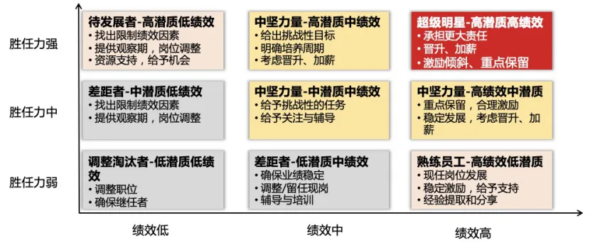 绩效考核结果以业绩、能力作为维度,可将员工分布至九宫格中,结果应用有所区分。