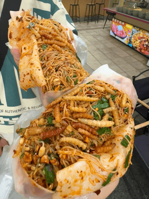 瞧这裹卷粉,竟然往里加了竹虫!一口下去,卷粉的软糯里突然爆出香香脆脆的惊喜,咯吱咯吱,越嚼越上头。虫子的鲜香被米皮温柔裹住,酥而不油,脆中带甜,这味道简直冲破想象!