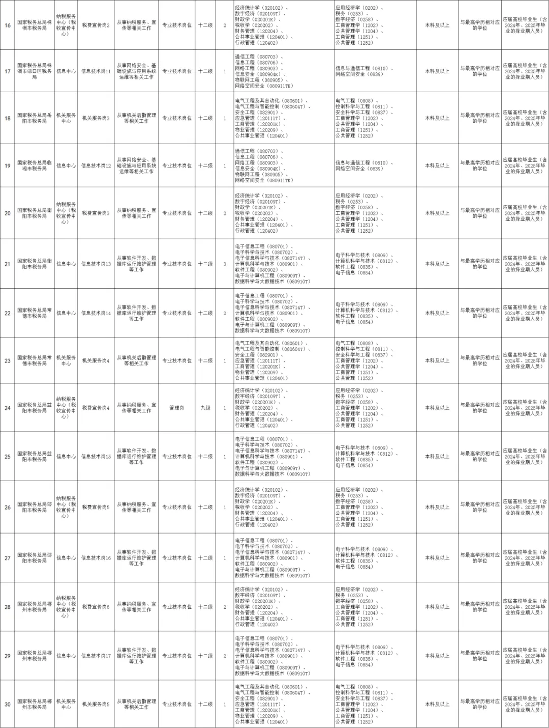 具体招聘人数和岗位条件详见《国家税务总局湖南省税务局系统2026年事业单位公开招聘岗位表》(附件1)。招聘岗位所要求的专业名称,本科生专业参照《普通高等学校本科专业目录(2025年)》(附件2),研究生专业参照《研究生教育学科专业目录(2022年)》(附件3)、中国研究生招生信息网专业库。