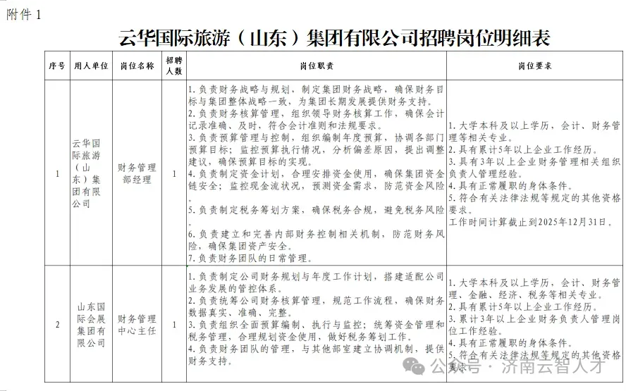 云华国际旅游(山东)集团有限公司:财务管理部经理1人。