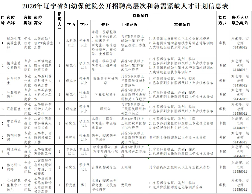 1.辽宁省妇幼保健院2026年面向社会公开招聘高层次和急需紧缺人才计划信息表
