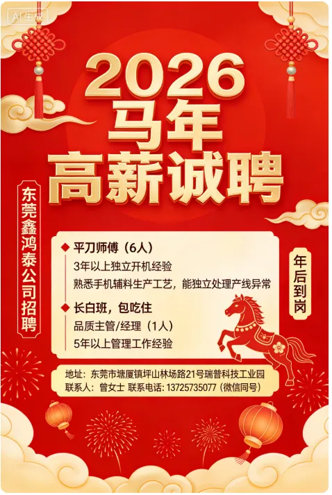 招聘临时工:平刀师傅 工价50-55;具体试机定薪。需要满足跨年,有意向可转正;