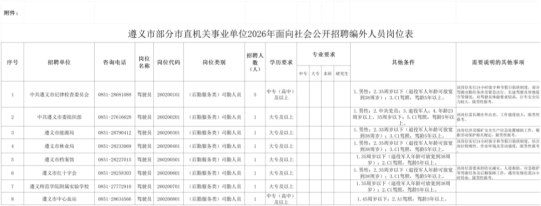 本次计划招聘编外人员(驾驶员岗位)12名,身份性质为非行政编制、非事业编制人员。具体招聘岗位要求,详见附件《遵义市部分市直机关事业单位2026年面向社会公开招聘编外人员岗位表》(以下简称《岗位表》)。