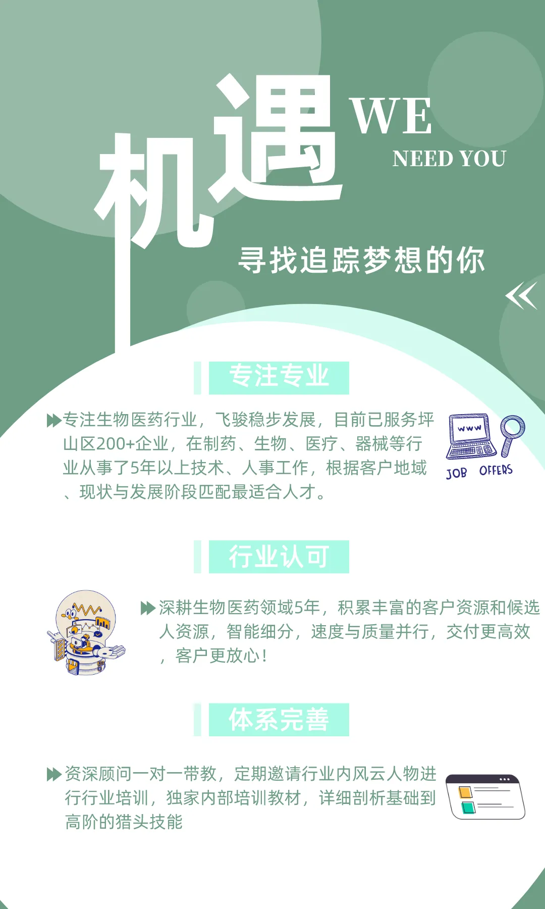立足坪山,提供中高端人才引才、医药咨询、人力资源托管、产学研合作交流等服务,至力于海内外生命大健康产业线上线下资源整合及人力资源深入开发。