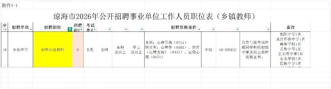(一)应聘人员应具备以下基本条件:1.具有中华人民共和国国籍;2.遵守宪法和法律;3.具有良好的品行和职业道德;4.具有岗位所需的学历、专业或技能条件;(要求专业对口:本科:心理学类(0711);研究生:心理学(0402)、教育(心理方向)(0451)、应用心理(0454) )5.适应岗位要求的身体条件;6.具备岗位需要的其他条件;7.招聘岗位规定的资格条件。(二)具有下列情形之一的人员不得报名应聘:1.尚未解除党纪、政务处分或正在接受纪律审查、监察调查的;2.刑事处罚期限未满或涉嫌违法犯罪正在接受调查的;3.在公务员招录、事业单位公开招聘中违纪违规且处理期限未满的;4.公务员或事业单位工作人员处于试用期内或未满最低服务年限的;5.失信被执行人;6.拒绝、逃避征集服现役且拒不改正的应征公民;以逃避服兵役为目的,拒绝履行职责或逃离部队且被军队除名、开除军籍或者被依法追究刑事责任的军人;7.在读的全日制非应届毕业生;8.法律、法规规定的其他不得报考的情形。三、招聘程序(一)发布招聘公告招聘公告通过琼海市人民政府门户网(http://qionghai.hainan.gov.cn)向社会公布,包括各招聘单位具体的招聘职位、招聘职数、报考资格条件和有关要求。(二)网上报名1.报名时间2026年2月2日8:00至2026年2月8日17:002.报名方式本次招聘采取网上报名的方式,不收取报名费。报考人员登录全国人事考试服务平台报名系统(以下简称系统)进行网上报名,网址:http://zp.cpta.com.cn/tyzpwb/?examid=dbdIdh(全国人事考试服务平台)3.提交材料:(1)身份证(正反面)(报名必须使用有效期内的二代身份证,报名与考试时使用的身份证必须一致)。(2)户口簿(户口簿首页及本人页)。(3)学历证书以及招聘岗位要求的学位证书等其他证书。留学回国和在港澳台取得学历学位的报考人员,还须出具教育部门的学历认证材料。2026年应届毕业生需提供学校出具的准许2026年8月1日前毕业的证明(含学历、学位、专业等)。报考教师岗位尚未取得教师资格证书的考生,应承诺在2026年8月1日前取得相应学科、符合该岗位学段的教师资格证书。(4)近期1寸免冠电子照片(不允许拉伸、翻拍,不过度美化,非生活照)。(5)驻琼海部队随军家属须提供经解放军和武警部队旅(团)级以上单位政治工作部门批准的《干部申请家属随军报告表》。注:上传材料统一为JPG格式,单个大小300K以内。4.报名查询报名系统于2026年2月8日17∶00准时关闭,报考人员提交报名材料后,须及时登录网上报名系统查询资格审查结果。参考往年报名情况,报名初始阶段人数较少,资格审查速度较快,报名最后阶段,尤其是最后两天报名集中,届时会影响资格审查速度。建议报考人员合理安排报考时间,根据本人专业、意愿和职业规划等尽早报名。每名考生限报一个岗位,资格初审通过的考生不能再报考其他岗位。考生须对所提供信息资料内容的真实性、准确性、合法性负责;信息填报不全导致资格初审不通过的,其后果由考生本人承担;对虚假填报信息的,一经查实,视情节轻重,取消考试资格或聘用资格,并按有关规定给予处理;对伪造、变造有关证件、材料、信息,骗取考试资格的,将按照考试违纪违规的有关规定处理。(三)资格初审。由省人事考试服务中心处理考生申请的成绩复核工作,原则上只接受对缺考、零分和违纪违规三种情形有异议的考生在规定时间内进行成绩复核,不接受考生查分申请。6.笔试合格分数线:根据笔试成绩和岗位需求情况,划定笔试合格分数线。7.笔试成绩发布:笔试成绩在琼海市人民政府网(http://qionghai.hainan.gov.cn)发布。(六)面试资格复审进入面试前,须按规定进行面试资格复审。面试人选从笔试合格分数线以上的报考人员中,根据笔试成绩和该岗位招考名额按比例由高分到低分依次确定。岗位的招聘人数在10人(含10人)以上的,比例为1∶2;岗位的招聘人数在9人(含9人)以下的,比例为1∶3。末位出现并列的,一并进入面试。达不到规定比例的,按实际达到笔试合格分数线的应聘人员确定面试人选。应聘人员自愿放弃或资格审查不合格等原因产生的空缺,则按照达到笔试合格分数线以上的笔试成绩从高分至低分依次递补。面试资格复审人员须提供以下材料,在规定时间内到指定地点进行复审:(1)报名登记表(登录系统打印)、准考证各1份;(2)户口簿原件及复印件各1份。(3)身份证原件及复印件各1份。(4)岗位有学历学位要求的,提供学历证书、学位证书原件及复印件各1份。(5)岗位有专业技术资格、职业资格等要求的,提供相关证书、证明原件及复印件各1份。(6)留学回国和在港澳台取得学历学位的报考人员,还需出具教育部门的学历认证材料原件及复印件各1份。(7)2026年应届毕业生须提交学校出具的准许2026年8月1日前毕业证明(原件)。(8)在编在岗人员报考,须提交当地组织人事部门同意报考证明;委培、定向、“四项目”人员,须出具主管部门同意报考证明。以上同意报考证明,须在报名日期之前取得。(9)“三支一扶”高校毕业生、“大学生志愿服务中西部计划”人员报考定向岗位的,提供主管部门出具的截止至2026年8月31日在琼海市服务期满且考核合格证明。(10)驻琼海部队随军家属报考定向岗位的,须提供经解放军和武警部队旅(团)级以上单位政治工作部门批准随军的“干部申请家属随军报告表”;(11)报考教师岗位尚未取得教师资格证书的考生,须提供