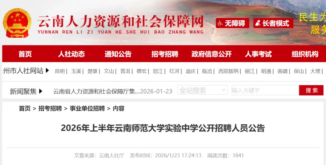 (一)公开招聘公告通过云南省人力资源和社会保障厅门户网站(网址:http://hrss.yn.gov.cn/)和云南师范大学实验中学门户网站(网址:http://www.ynsdsyzx.cn)面向社会发布,后续相关招聘信息请及时关注云南师范大学实验中学门户网站。因查看其他渠道错误信息造成的报考失误,由应聘人员自行负责。