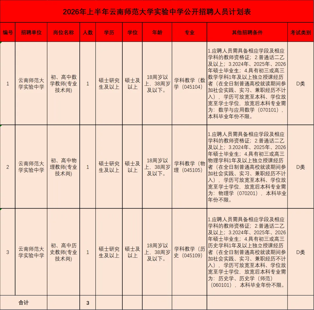 按照《事业单位公开招聘人员暂行规定》(人事部令第6号)、《云南省事业单位公开招聘工作人员办法》(云人社发〔2016〕182号)等法律法规,根据工作需要,经云南省教育厅审核同意报云南省人力资源和社会保障厅核准,2026年上半年云南师范大学实验中学面向社会公开招聘人员3名,现将有关事项公告如下: