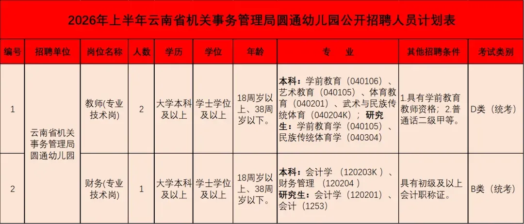 云南省机关事务管理局圆通幼儿园公开招聘人员3名;具体招聘岗位及招聘条件,详见《2026年上半年云南省机关事务管理局圆通幼儿园公开招聘人员计划表》。