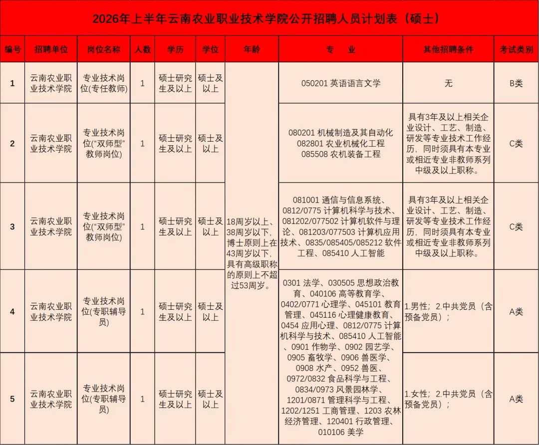 云南农业职业技术学院2026年上半年公开招聘人员5名。具体招聘岗位及招聘条件,详见《2026年上半年云南农业职业技术学院公开招聘人员计划表(硕士)》(附件1)。