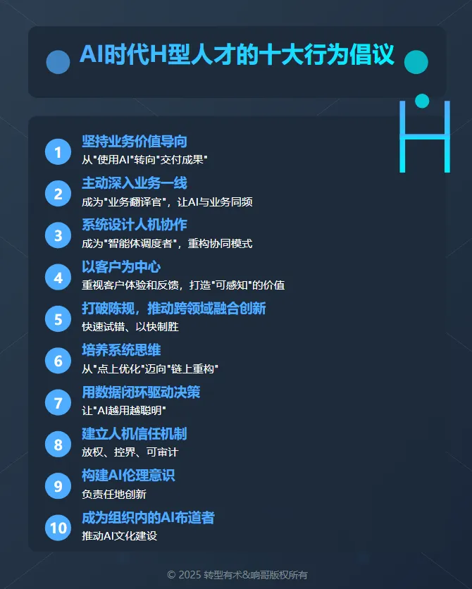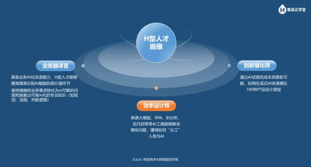 H型人才在企业中承担 “硅基员工指挥官” 角色,引领AI赋能的组织再造与业务转型。
