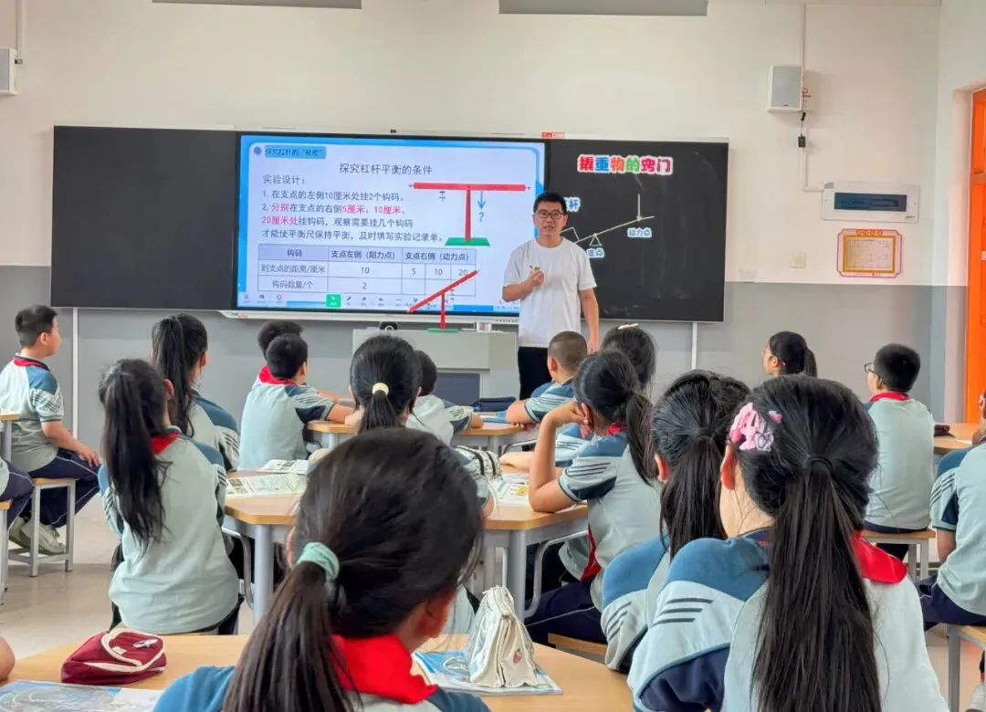 第二节是由长师附小总校区的林水发老师所授的《撬重物的窍门》,这节课是五年级下册“简单机械”单元的第一课。林老师从撬开铁罐活动入手,自然而然的引入本课课题,接着利用平衡尺探究杠杆的秘密,让学生从记录数据到分析数据,使学生的思维不断得到提升,从而让学生在数据的基础上理解杠杆省不省力的奥秘,并能运用所学知识分析生活中杠杆的类型。从而通过小小杠杆,“撬”动新的“课堂”。