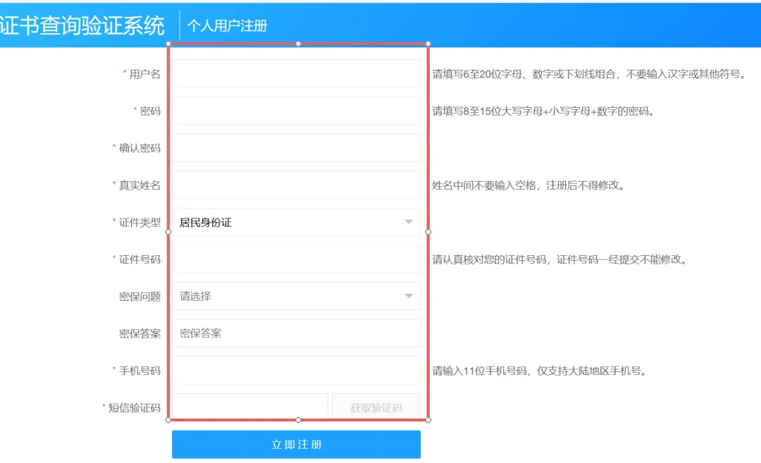 ※将红框内信息填写完成后,获取验证码,输入完成后点击立即注册