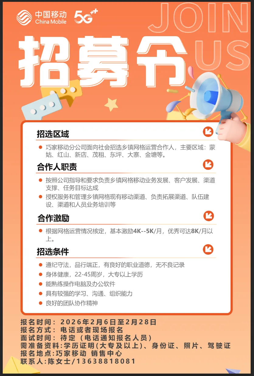 当前位置:首页>招聘>招聘7人,工资8千+,工作地点在巧家蒙姑红山等乡镇