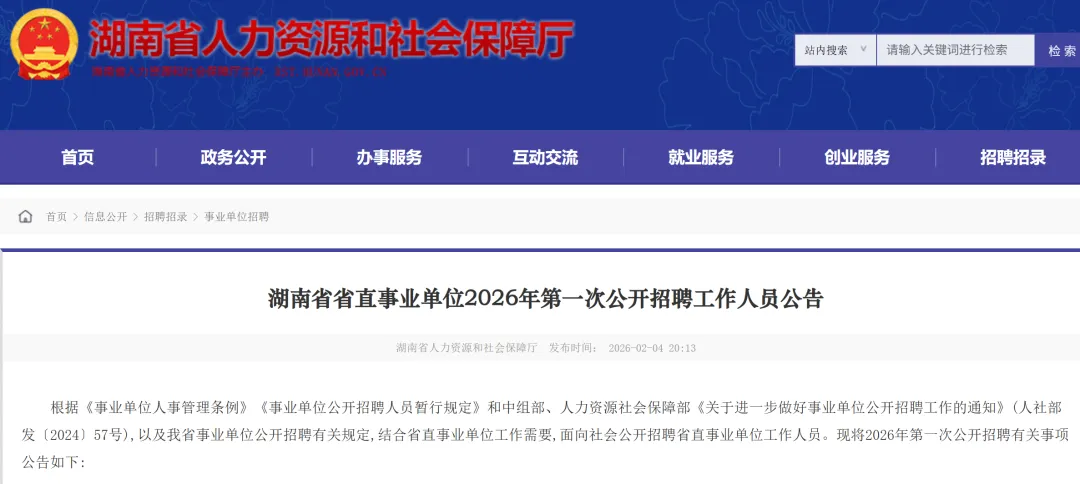 2月4日,湖南省人力资源和社会保障厅发布湖南省省直事业单位2026年第一次公开招聘工作人员公告。公告显示,湖南省省直事业单位2026年第一次公开招聘共发布招聘岗位102个,计划招聘175名工作人员,其中管理岗位计划招聘48名,专业技术岗位计划招聘127名。