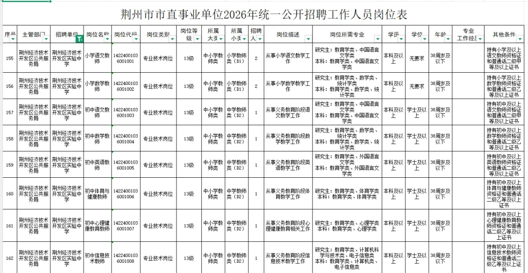 详情见荆州市人社局网站《荆州市市直事业单位2026年统一公开招聘工作人员公告》