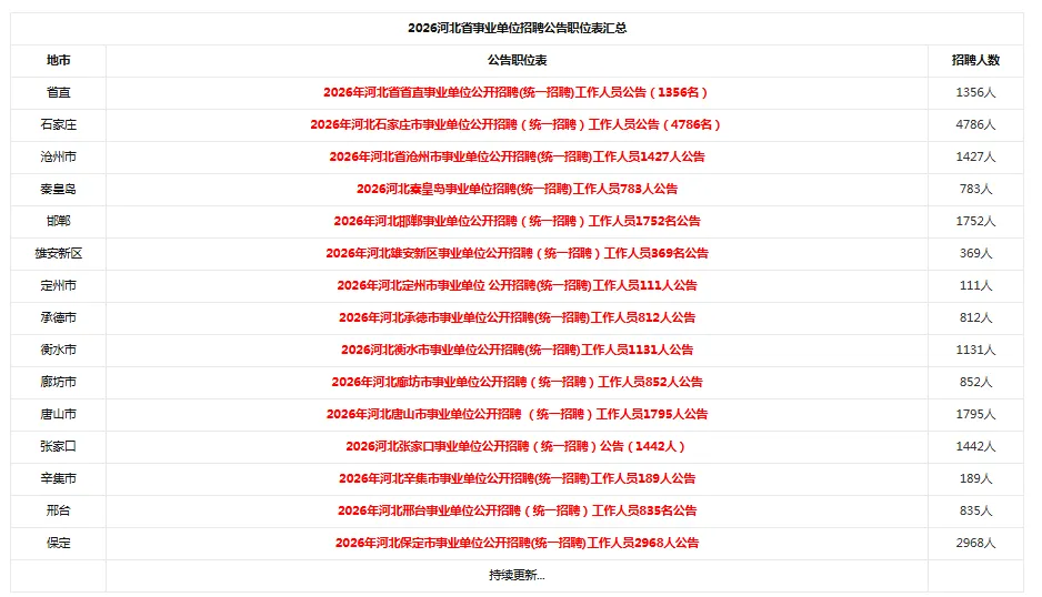 本次共招聘事业单位工作人员4786名,各招聘单位的招聘岗位数量、考试类别、资格条件详见《石家庄市2026年事业单位公开招聘(统一招聘)岗位信息表》(附件1),咨询电话详见《石家庄市2026年事业单位公开招聘(统一招聘)咨询电话表》(附件2)。