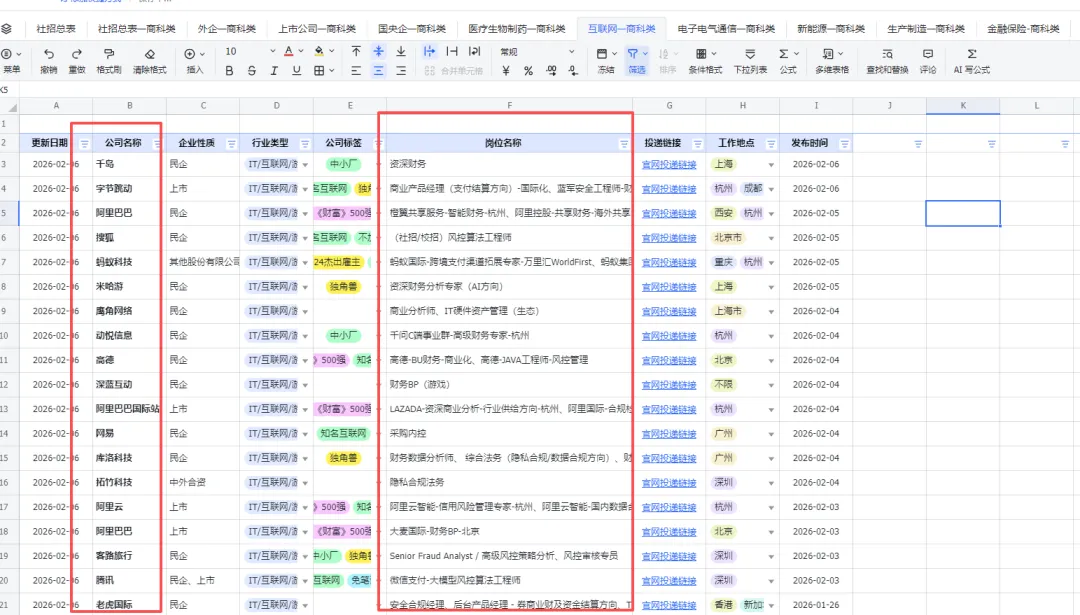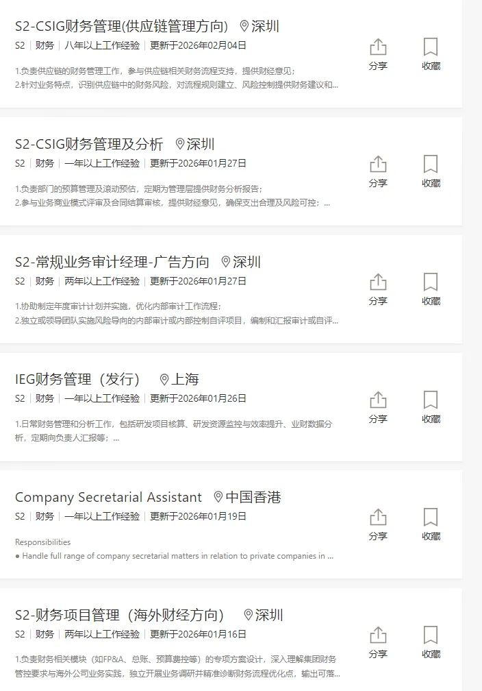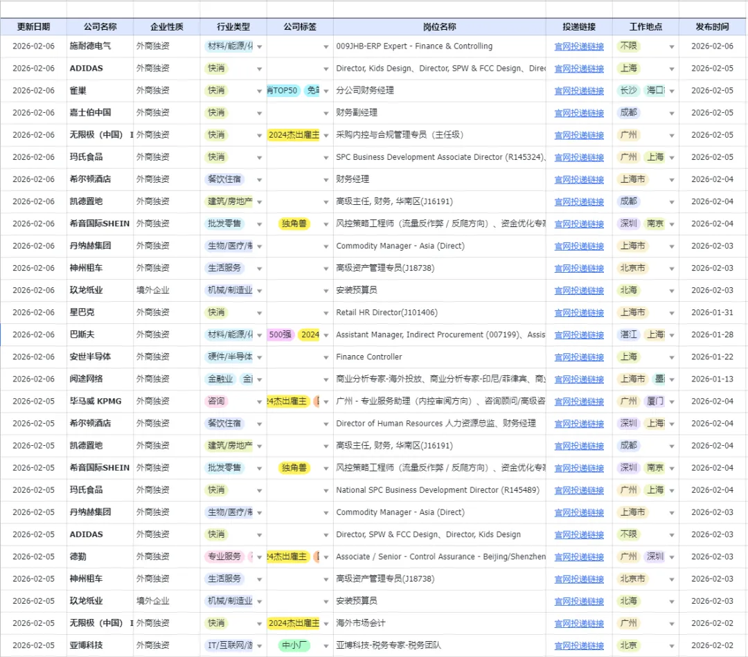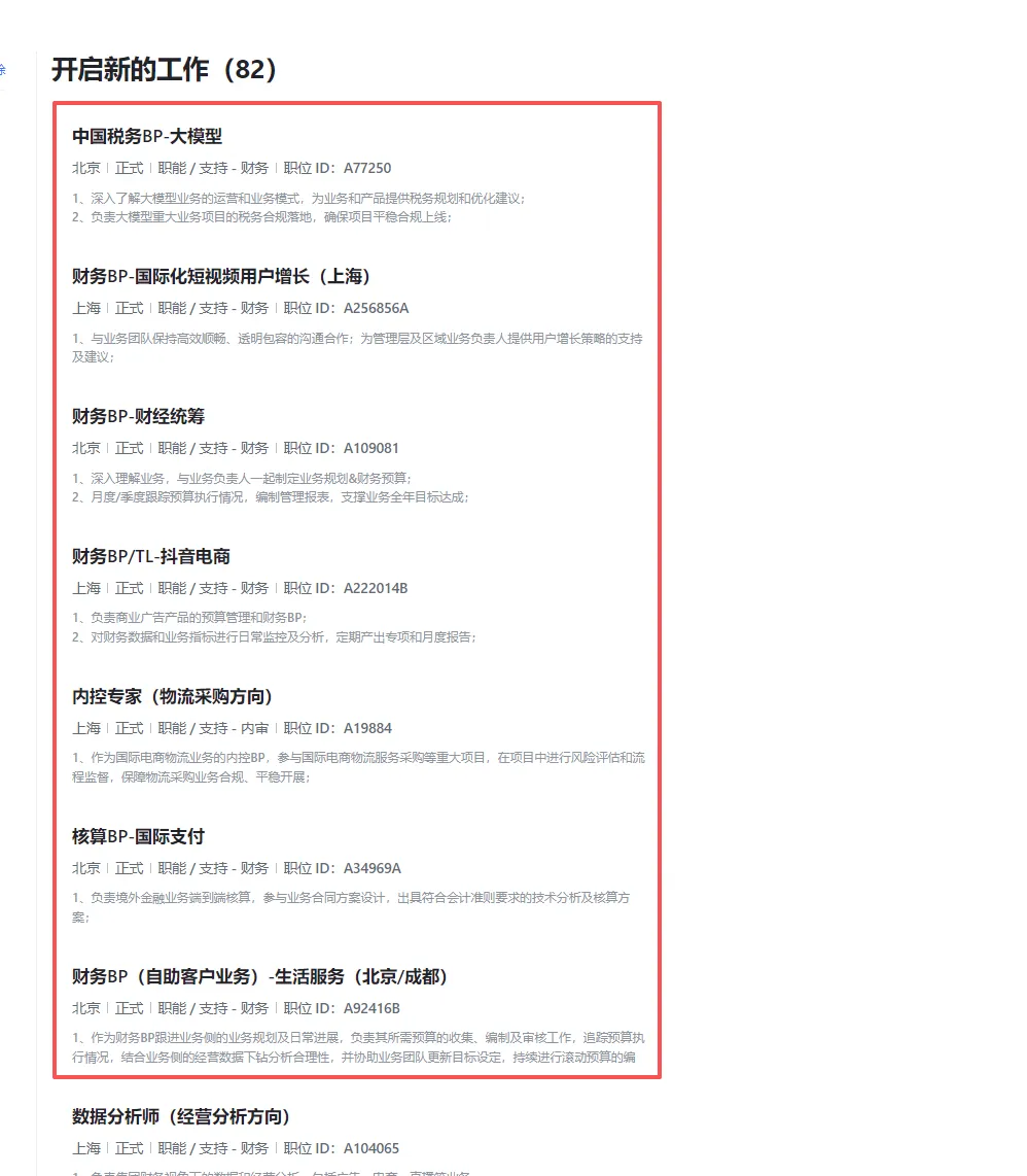 大家好,我是Max,目前和一群志同道合,在乙方和甲方的财会都深耕多年的小伙伴们做着求职辅导。我们的导师团队阵容强大,有是从业20多年的财务总监,有前身是四大高级经理,现在是甲方内控内审部门长的前辈,有是四大经理转型大厂甲方财务BP后晋升至甲方虚线leader的,有在快消外企担任某业务线的财务负责人。划重点:团队开发了自动拉取社招岗位清单,市面上企业只要官网发布就会当天拉取并更新,欢迎咨询获取;我们定期更新一些岗位到此公众号上,今日份工作分享:1、互联网