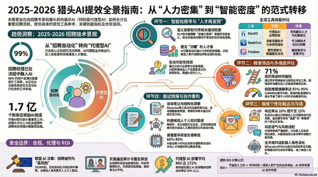 这种趋势在2025年已经表现得极为明显,组织的关注点已经从“是否使用AI”转向了“如何优化AI的性能”。约99%的招聘经理表示已在招聘流程中融入了AI工具,而98%的用户反馈这些工具显著提升了招聘效率 3。这种普及不仅改变了猎头顾问的日常工作流,更在深层次上重塑了人才获取的战略价值。未来的猎头不再是信息的中间商,而是利用AI处理速度、规模和信号检测,自身则专注于上下文理解、共情和复杂决策的战略顾问 4。