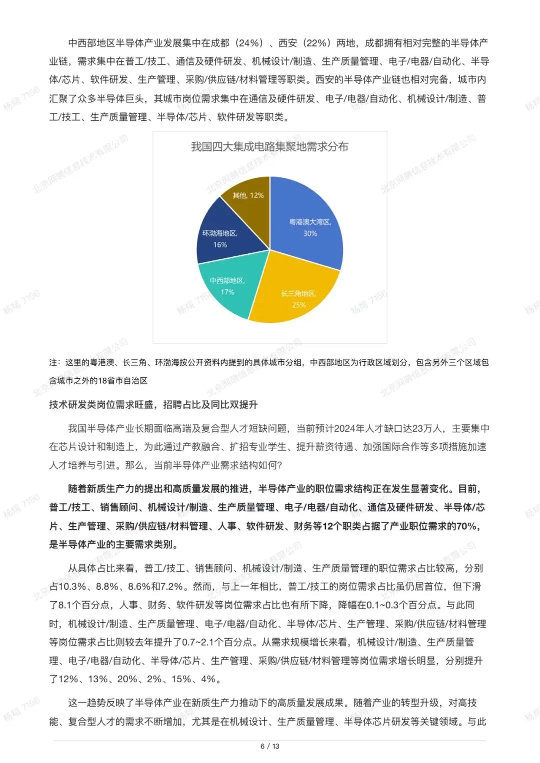 报告基于智联猎头 2024 年 1.3 万份岗位、8.2 万份简历及 200 家企业访谈,研判 2025 年中国半导体产业规模将再攀新高,人才缺口预计 23 万。核心结论:AI/HPC 需求+国产替代双轮驱动,产业向高质量发展跃迁;四大集聚区(环渤海、长三角、粤港澳、中西部)贡献全国 82% 岗位;芯片研发、生产质量管理、材料供应链三类岗位招聘占比同比提升 0.7~2.1 个百分点,企业愿为 5 年以上经验芯片人才开出 5 万+月薪,猎头渗透率仅 30%,高端引才仍存巨大空间。