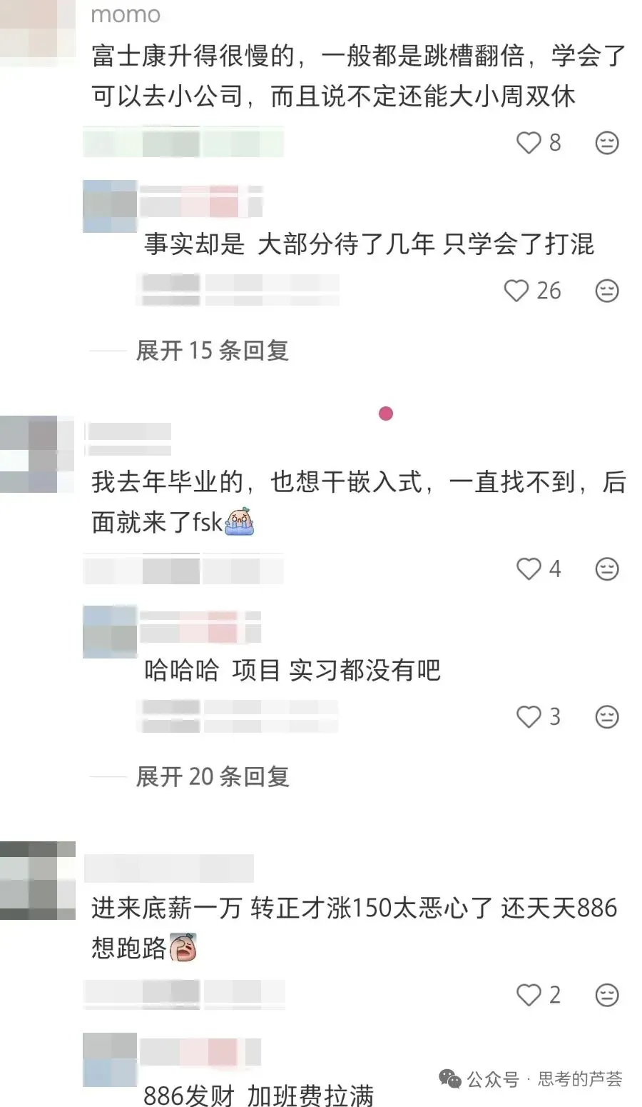 我也打听了很多跳槽失败的案例,有个同事跳槽到歌尔,刚去了3个月,就遇到歌尔裁员,因为是新人,直接被裁掉了,失业了两个多月才找到新工作;还有个同事跳槽到一家小的电子厂,看似薪资涨了30%,但进去后才发现,公司不按规定交五险一金,加班费也经常拖欠,而且加班强度比富士康还大,每天要加班10个小时以上,干了半年就受不了,又重新找工作,反而浪费了时间和精力。