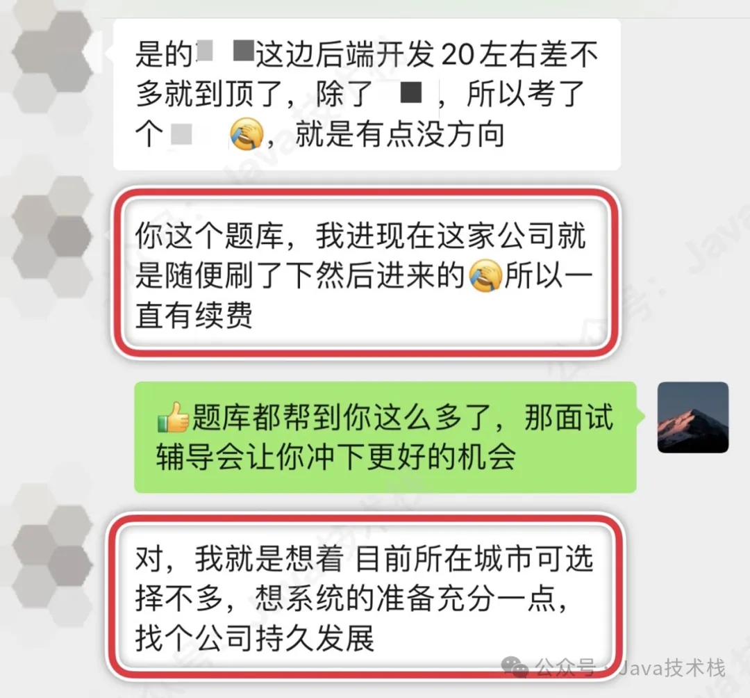 面试辅导含 Java面试库永久题库 + 大厂场景题 + 模拟面试 + 学习规划 + 技术指导 + 简历优化 + 简历问题辅导 + 面试复盘 + 求职指导等一条龙服务,全程大厂导师 1 v 1 辅导陪跑,已帮助许多小伙伴成功上岸。